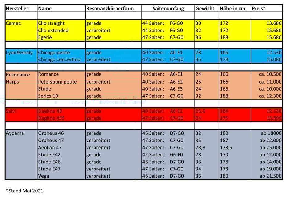 In der Übersicht unten sind alle (Holz-)Harfen, die für meine Belange in Frage kamen, aufgelistet. Die Tabelle kann anderen Suchenden auf Anfrage gern als Excel-Tabelle zur Verfügung gestellt werden.